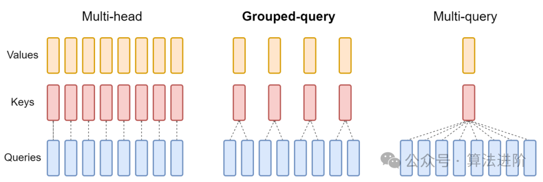 上图显示多头注意力有多个键值头(左)。「分组查询注意力(中心)的键值头多于一个,但少于查询头的数量,这是内存需求和模型质量之间的平衡」。多查询注意力(右)具有单个键值头,有助于节省内存。