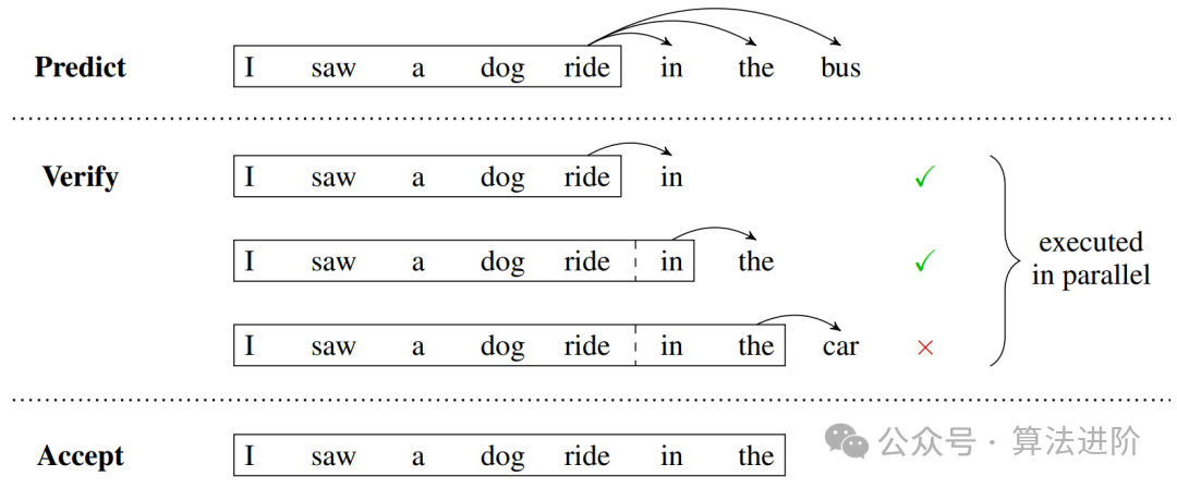 上图为预测推理的示例,其中临时模型临时预测并行验证或拒绝的多个未来步骤。在这种情况下,临时模型中的前两个预测token被接受,而最后一个在继续生成之前被拒绝并删除。