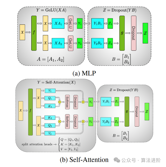 上图(a)显示了两层 MLP Tensor并行的示例,每一层都由一个圆角框表示。在第一层中,权重矩阵 分为 和 。对于输入 ,可以在同一批次不同设备上计算 和 ,其中,是identity 操作。这将每个设备上存储权重的内存需求减半。归约操作 组合了第二层的输出。