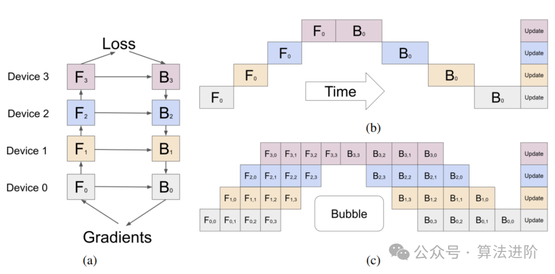 该方法的「缺点是,由于处理的顺序性质,某些设备或层在等待前一层的输出(激活、梯度)时可能保持空闲状态」。这会导致前向和后向传递效率低下或出现“Pipeline bubbles”。在上图(b)中,白色空白区域是Pipeline并行性产生的Pipeline bubbles,其中设备闲置且未得到充分利用。