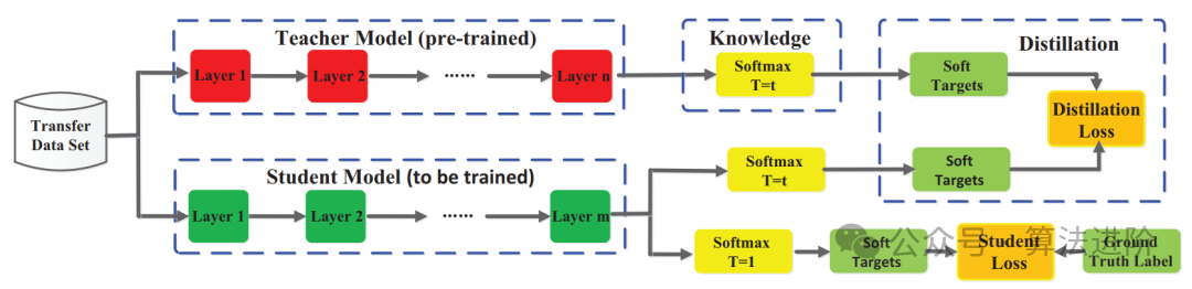 上图显示了知识蒸馏通用的总体框架(https://arxiv.org/pdf/2006.05525)。教师的 logits是学生使用蒸馏损失进行优化的软目标。其他蒸馏方法可能会使用其他损失措施来从老师那里“蒸馏”知识。