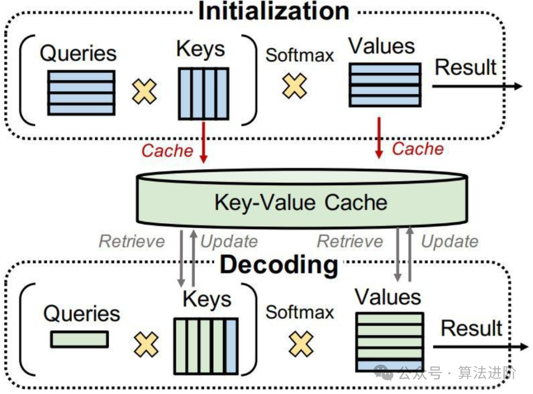 「为了避免在每个时间步重新计算所有tokens的这些张量,可以将它们缓存在 GPU 内存中」。每次迭代,当需要计算新token时,它们都会被添加到正在运行的缓存中,以便在下一次迭代中使用。在一些实现中,模型的每一层都有一个KV缓存。下图展示了KV的缓存机制。