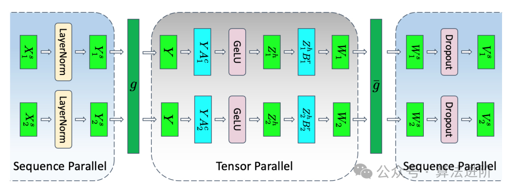 如Reducing Activation Recomputation in Large Transformer Models所示,这些操作在输入序列中是独立的,并且这些操作可以沿着“序列维度”进行分区,从而提高内存效率。这称为序列并行性。