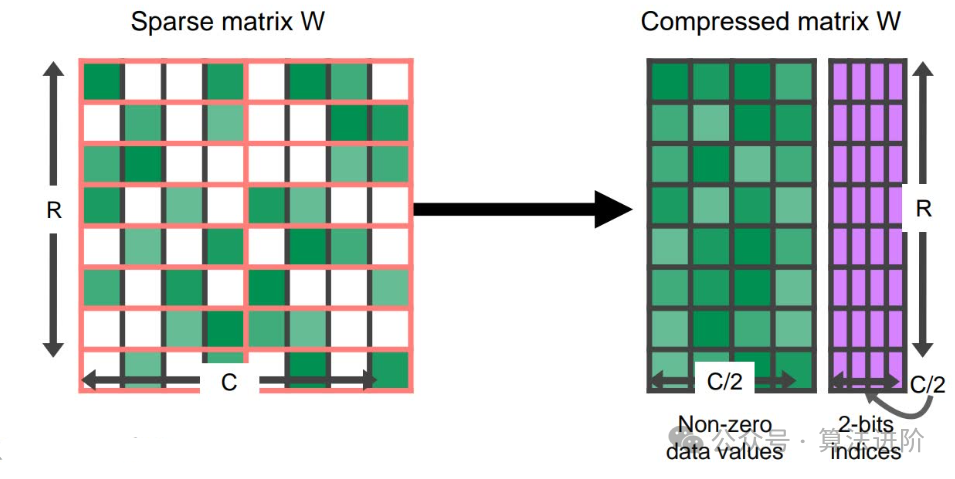 与量化类似,事实证明,许多深度学习模型对于修剪或用 0 本身替换某些接近 0 的值具有鲁棒性。「稀疏矩阵是许多元素为 0 的矩阵」。这些矩阵可以用压缩形式表示,比完整的稠密矩阵占用的空间更少。