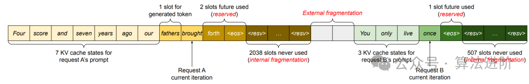 有时,KV 缓存会静态地“过度配置”(over-provisioned),以考虑最大可能的输入(支持的序列长度),因为输入的大小是不可预测的。例如,如果模型支持的最大序列长度为 2,048,则无论请求中输入和生成的输出的大小如何,都将在内存中保留大小为 2,048 的数据。该空间可以是连续分配的,并且通常其中大部分未被使用,从而导致内存浪费或碎片。该保留空间在请求的生命周期内被占用。下图展示了由于过度配置和低效的 KV 缓存管理而导致的内存浪费和碎片。