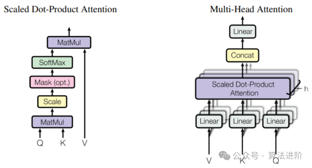 如下图所示(缩放点积注意力(左)和多头注意力(右)),多个并行注意力操作的输出被拼接后线性投影以组合起来。每个并行注意力层称为“头”,这种方法称为多头注意力(MHA)。