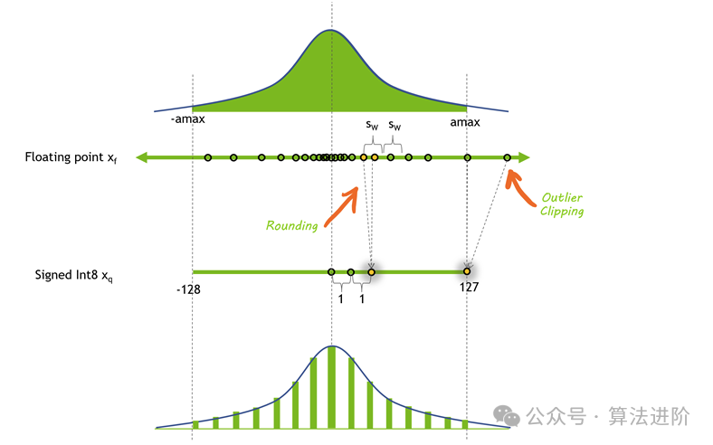 上图显示了一种可能的量化方法之前和之后的值分布。在这种情况下,会丢失一些精度,并且剪裁会丢失一些动态范围,从而允许以更小的格式表示值。