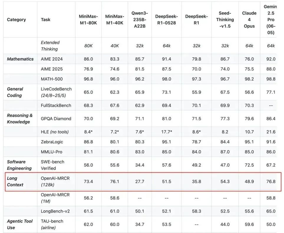 最近6月刚发且开源的Minimax的m1模型也采用了混合MoE架构,拥有32个专家。模型总参数量为456B,每个token激活45.9B参数。这再次印证了约10:1的总参数与激活参数之比,已成为大型MoE模型的一个行业基准,主要也带来了超长上下文方面的提升,整体的性能可以看表,还是表现的很不错的。