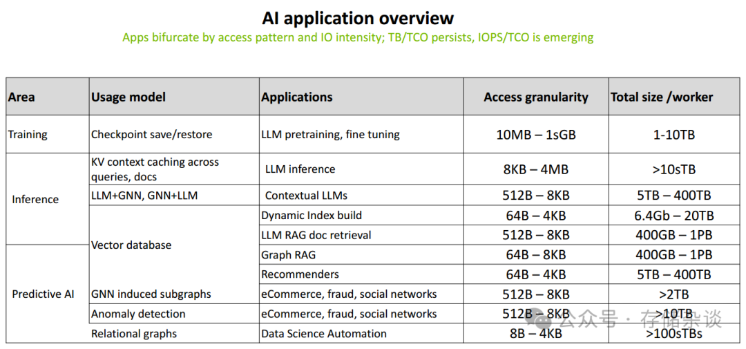 AI 应用并非 “一刀切”,而是根据访问模式和IO 强度呈现明显分化,对存储的要求也千差万别。FMS分享的应用特性表清晰揭示了不同场景的存储需求差异。