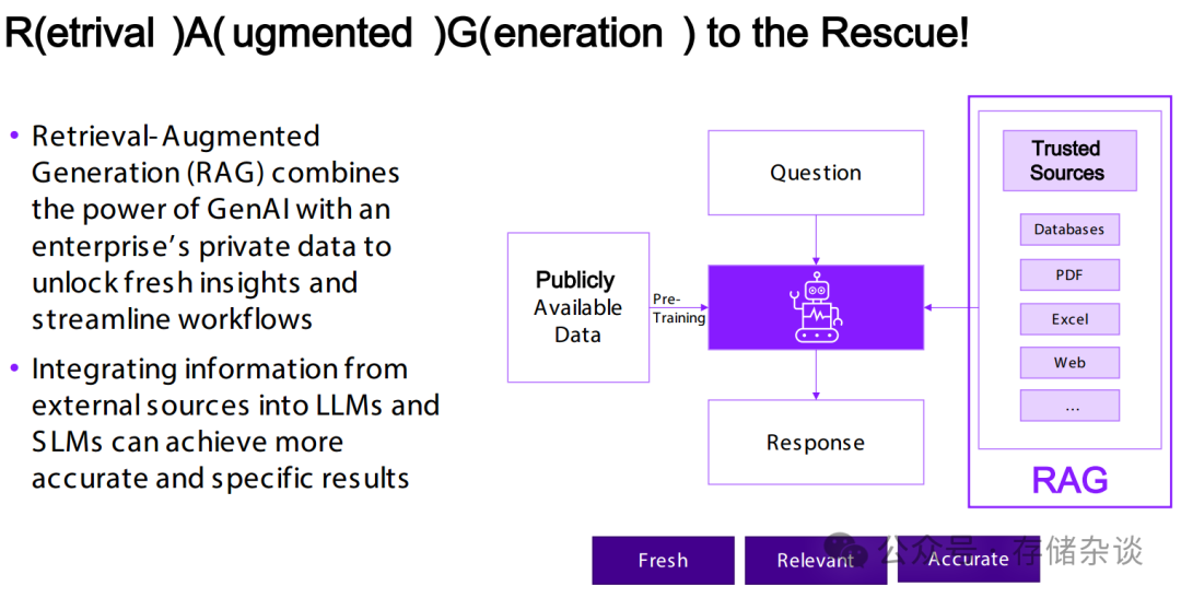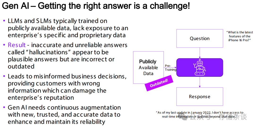 LLM “幻觉” 源于其仅依赖公开可用的训练数据(易过时、缺乏企业私有信息),而 RAG 通过整合企业私有数据(如数据库、PDF、Excel、网页等可信外部来源) 与 GenAI 能力,让 LLM 在生成输出前先检索实时、精准的特定数据,补充知识盲区,从而减少错误或过时答案的产生,提升输出准确性。