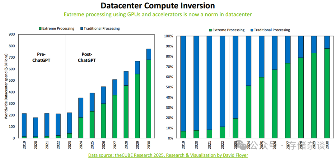 传统的、或者说我们大家熟知的数据中心架构,是基于CPU为核心的计算和存储体系,CPU在上层业务响应、数据流管理、底层数据管理等占据核心作用。下一代 AI 工作负载推动数据中心发生计算反转,以GPU 为核心的处理模式取代传统 CPU 主导的处理模式,成为数据中心的普遍选择。来自theCUBE Research 2025的研究数据显示,ChatGPT 等 AI 应用普及后,GPU 与加速器的应用占比大幅提升,传统处理模式占比显著下降。