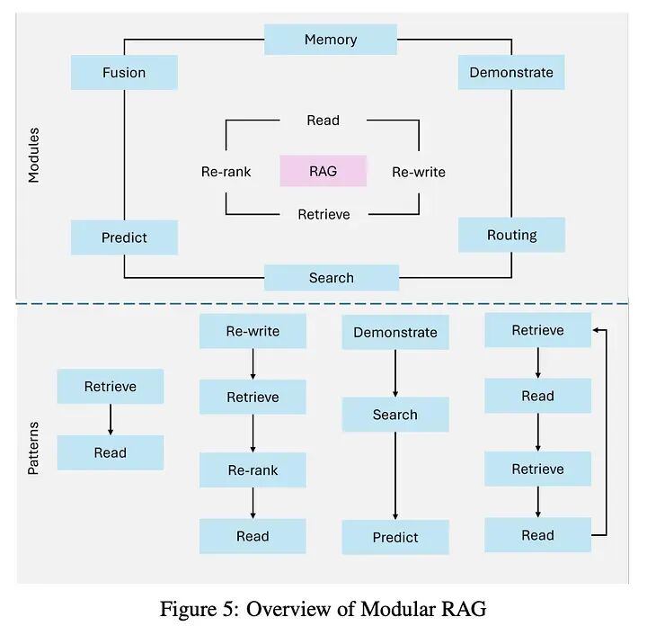 图5展示了模块化架构,展示了混合检索策略、可组合管道和外部工具集成。