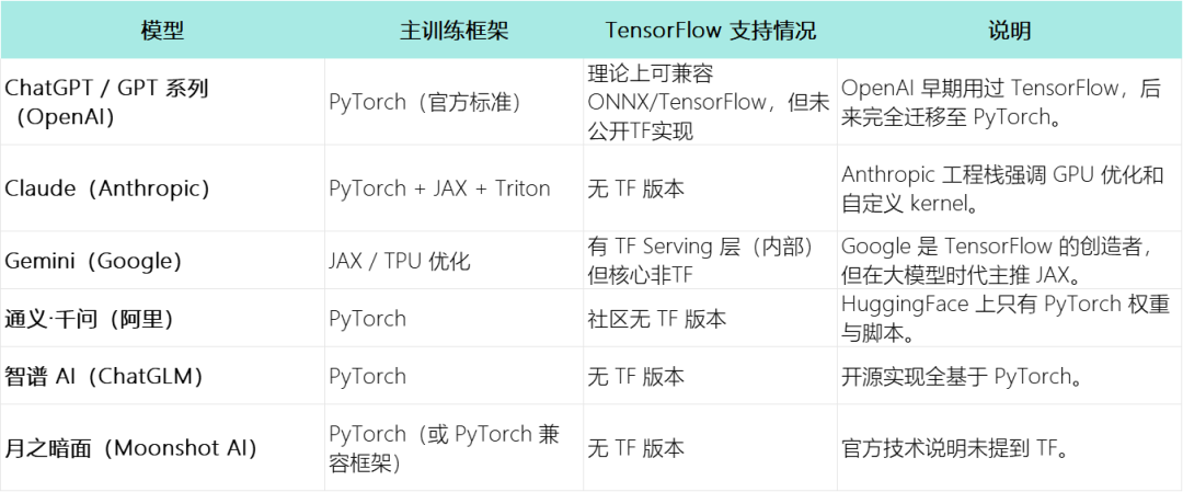 首先,不管是大洋彼岸的OpenAI、Anthropic,还是国内的通义千问、智谱、月之暗面,他们推出的大模型或开源实现,都提供或偏好Pytorch框架。