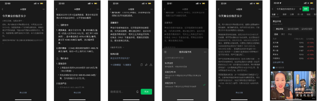 今年年初,在deepseek效应发酵的春节期间,微信上线了AI搜索功能。当时的AI搜索接入的是DeepSeek-R1模型。用户使用时,该模式会展示思考推理的流程,和独立的DeepSeek产品功能没什么差别。同时,这个“深度思考”提供的结果,其信息源既包括公众号、视频号等微信生态内容,也包括网页信息,并且在页面最下方还支持继续提问。