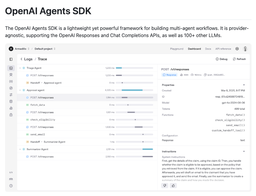 灵活性与可扩展性: 支持深度定制智能体逻辑,允许集成自定义 Python 函数工具;兼容第三方模型(如 Anthropic、Llama),不强制绑定 OpenAI 模型。
