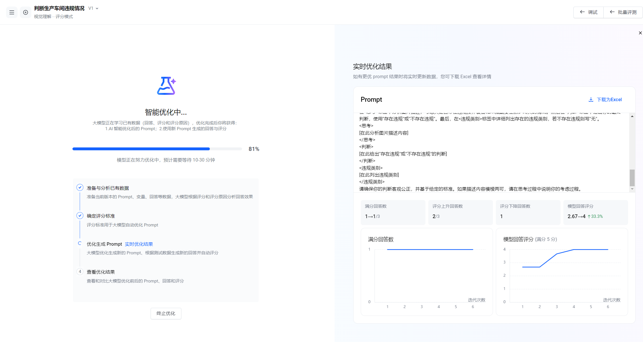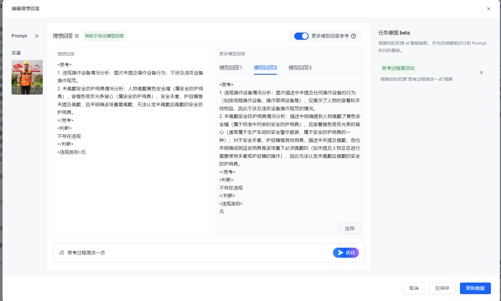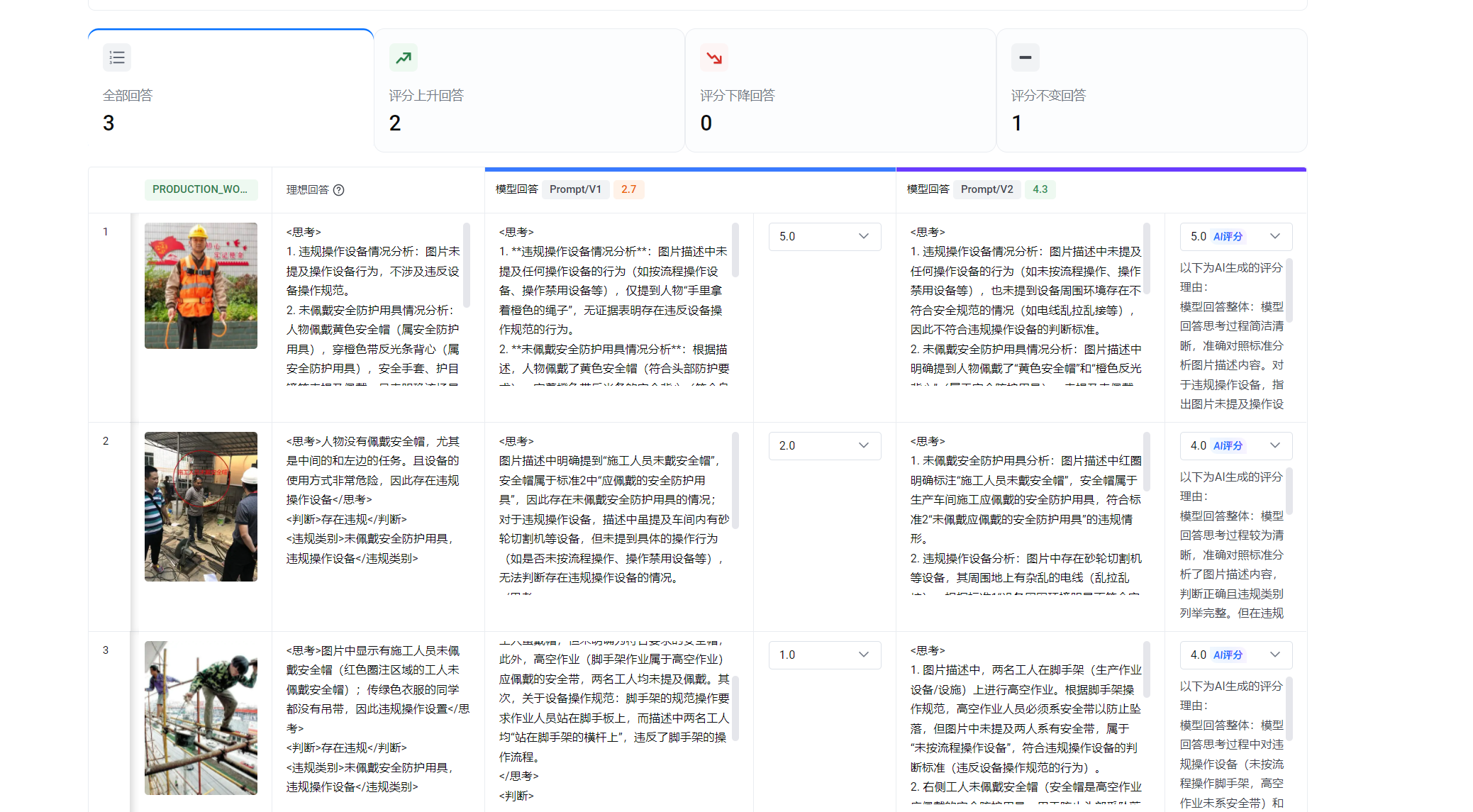 “就像你点外卖同时勾了‘微辣’和‘爆辣’两选项,想看看哪个更带劲。PromptPilot把 doubao-1.5-vision-pro 和 seed-1.6-thinking 同时扔锅里,给你端两盘菜:一盘说‘这工人没戴安全帽’,另一盘补一句‘他还站在叉车盲区’。哪个更毒舌,一目了然。”
