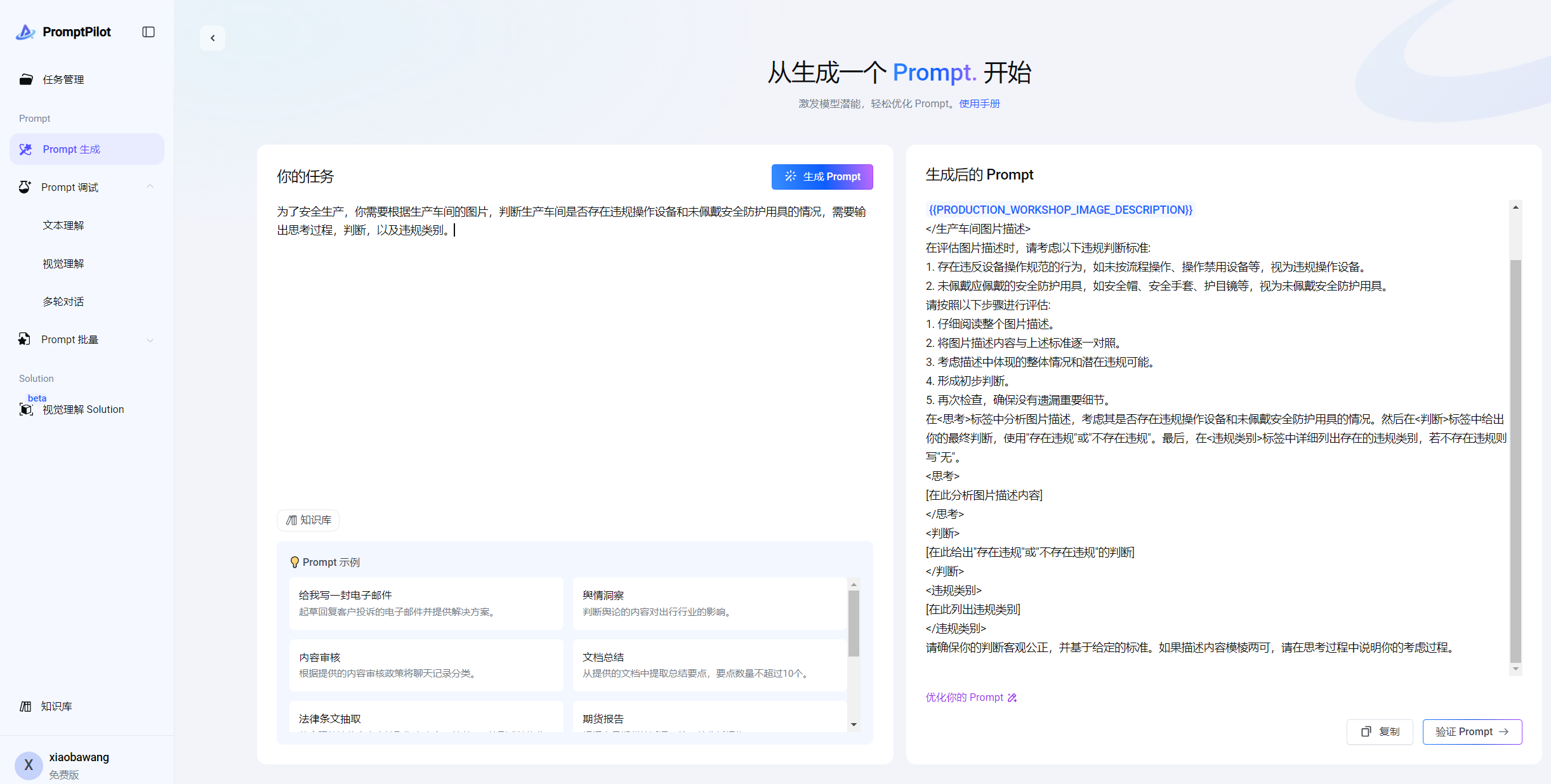 以前手写提示词,大模型总是识别不出我想要的,总以为是大模型能力,通过使用PromptPilot生产的提示词,才发现是自己写的提示词不准,导致大模型识别不出来。在实际操作中,PromptPilot 展现出了强大的功能实用性。它能够根据用户的需求和目标,提供多样化的提示词建议,并对用户设计的提示词进行分析和优化,指出其中的不足之处并给出改进方案。例如,Case1:质检巡检 --图片理解 中,