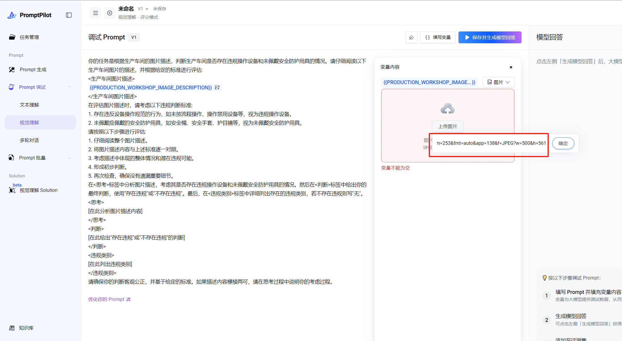 以前使用其他工具都是提前写好变量才能进行测试,这个PromptPilot使用感觉很不一样,支持(PRODUCTION_WORKSHOP_IMAGE_DESCRIPTION)等动态变量,适配视觉理解场景,体验效果真的舒服!