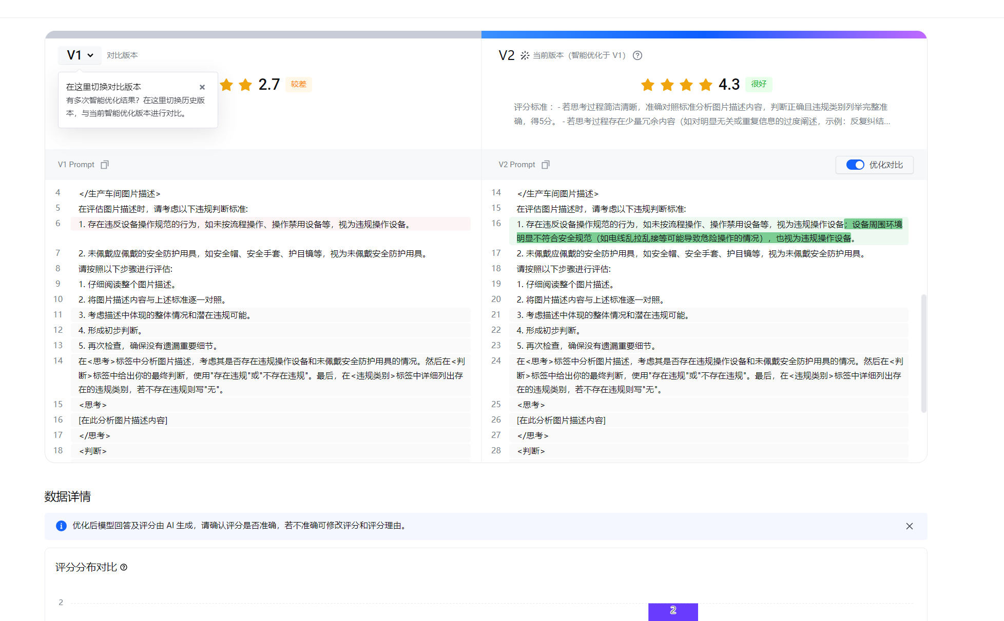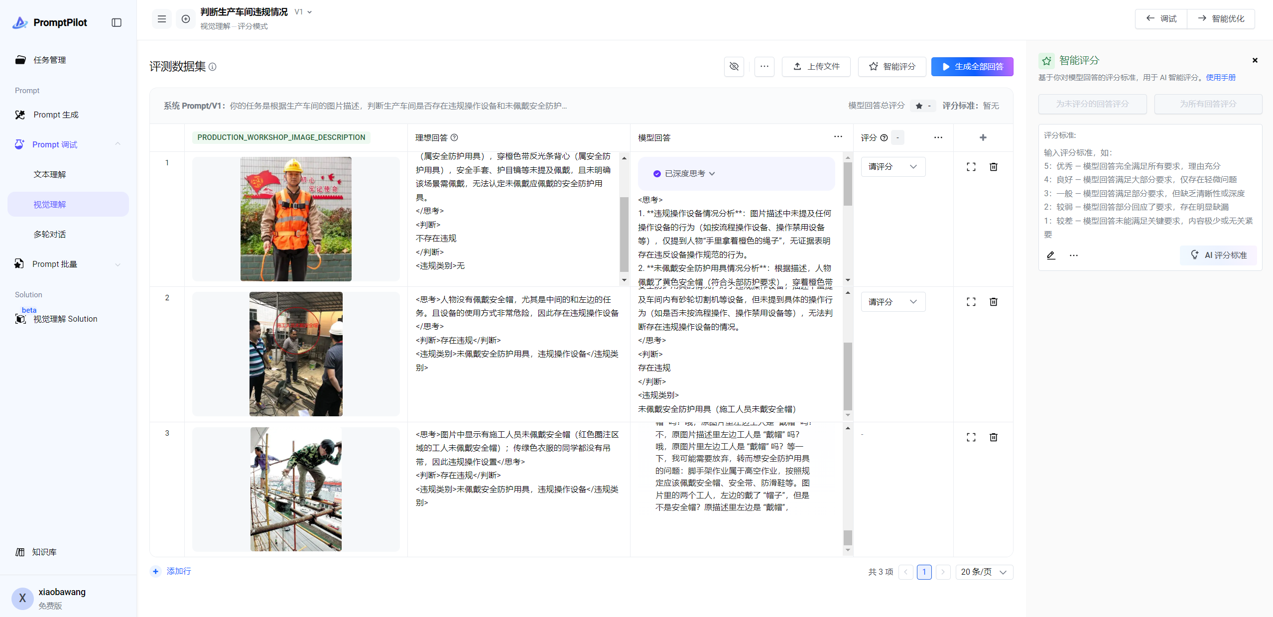 关键差异:当测试数据存在矛盾时(如"戴帽但未提及手套"),传统工具易陷入规则冲突,而PromptPilot通过**"潜在违规可能"**条款,实现模糊场景的智能权衡