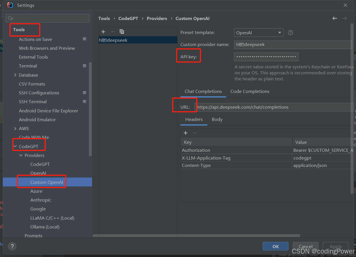 4.安装完成后,在目录File->settings->Tools下面能看到CodeGPT,在这里配置deepseek相关信息。