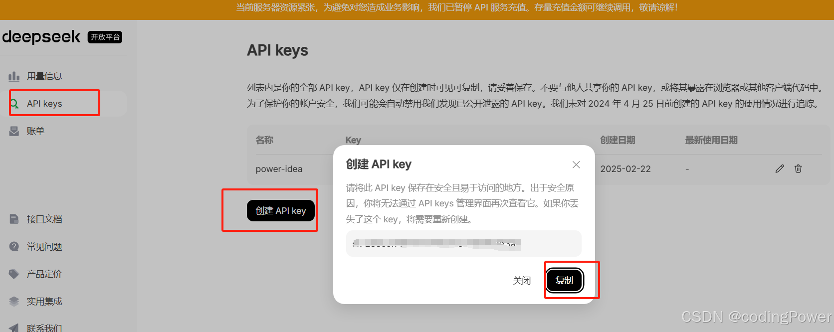 选择API keys ,点击创建API key ,会生成一个密钥,复制即可