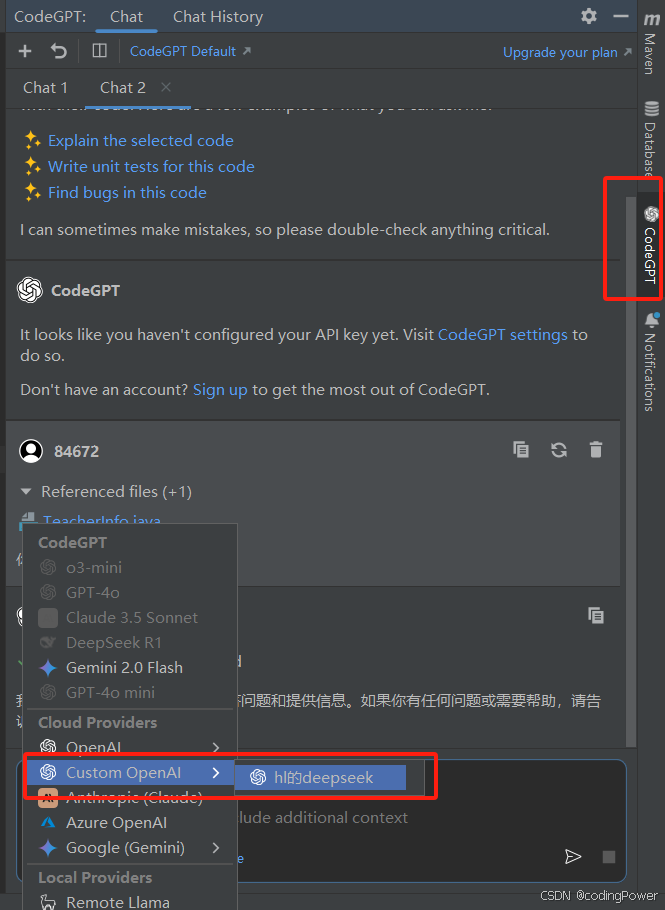 2.那怎么办呢,我们其实还可以对接其他免费的大模型,或者使用目前codeGpt自带的,也可以自己本地部署deepseek,然后用ollama配置,可以参考B站DeepSeek R1接入IDEA实战
