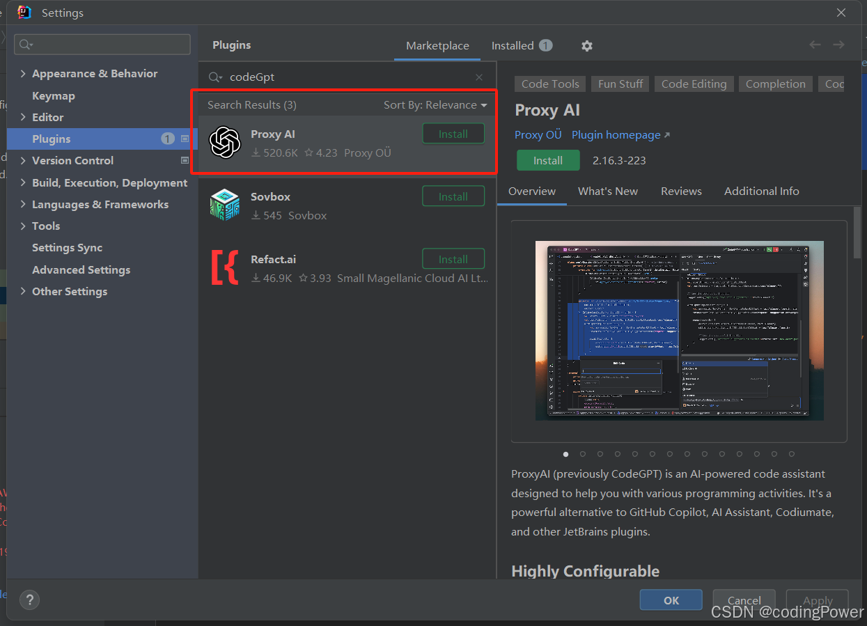 搜索Proxy AI(原来是codeGpt),点击install安装(如果没有搜到,可以去找相应的插件进行安装)