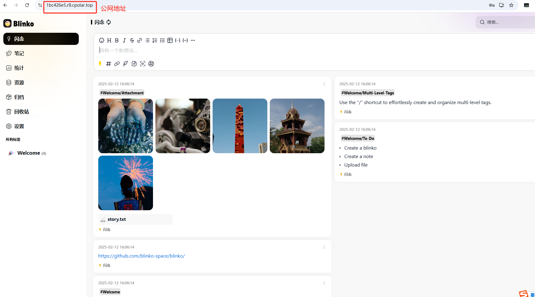 如图所示,现在就已经成功实现使用公网地址异地远程访问本地部署的blinko笔记啦!