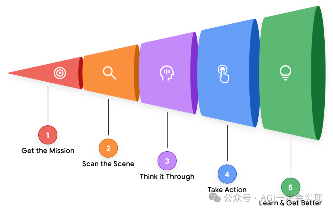 白皮书把 Agent 的工作过程抽象为一个五步循环,这是理解一切 Agent 行为的基础:
