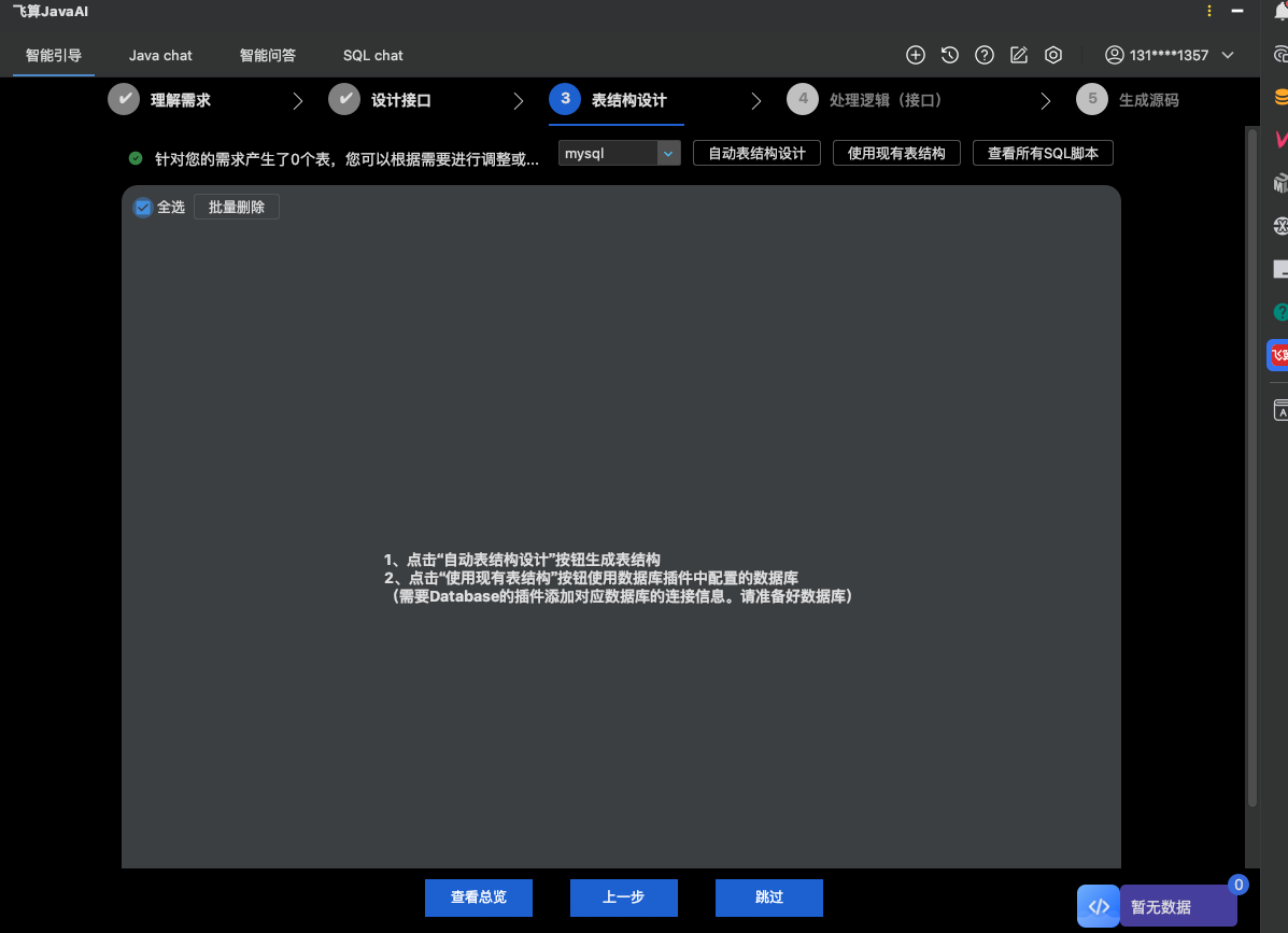 接口设计完成后,AI能自动推导出合理的数据库表结构: