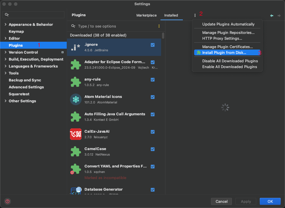 在IDEA中选择File > Settings > Plugins > Install Plugin from Disk