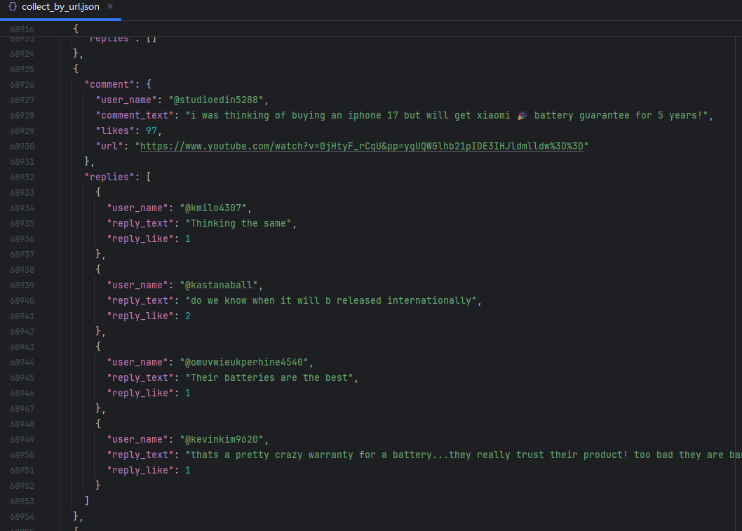 8. 至此,我们已分别获取了视频元数据的 JSON 文件和对应评论数据的 JSON 文件。下一步,将这两个数据集进行合并:以视频 URL 或视频 ID 为唯一键,将每条视频的评论数据嵌入到其对应的视频元信息中,实现“一个视频 + 其全部评论”的完整数据结构,便于管理和分析。代码如下:
