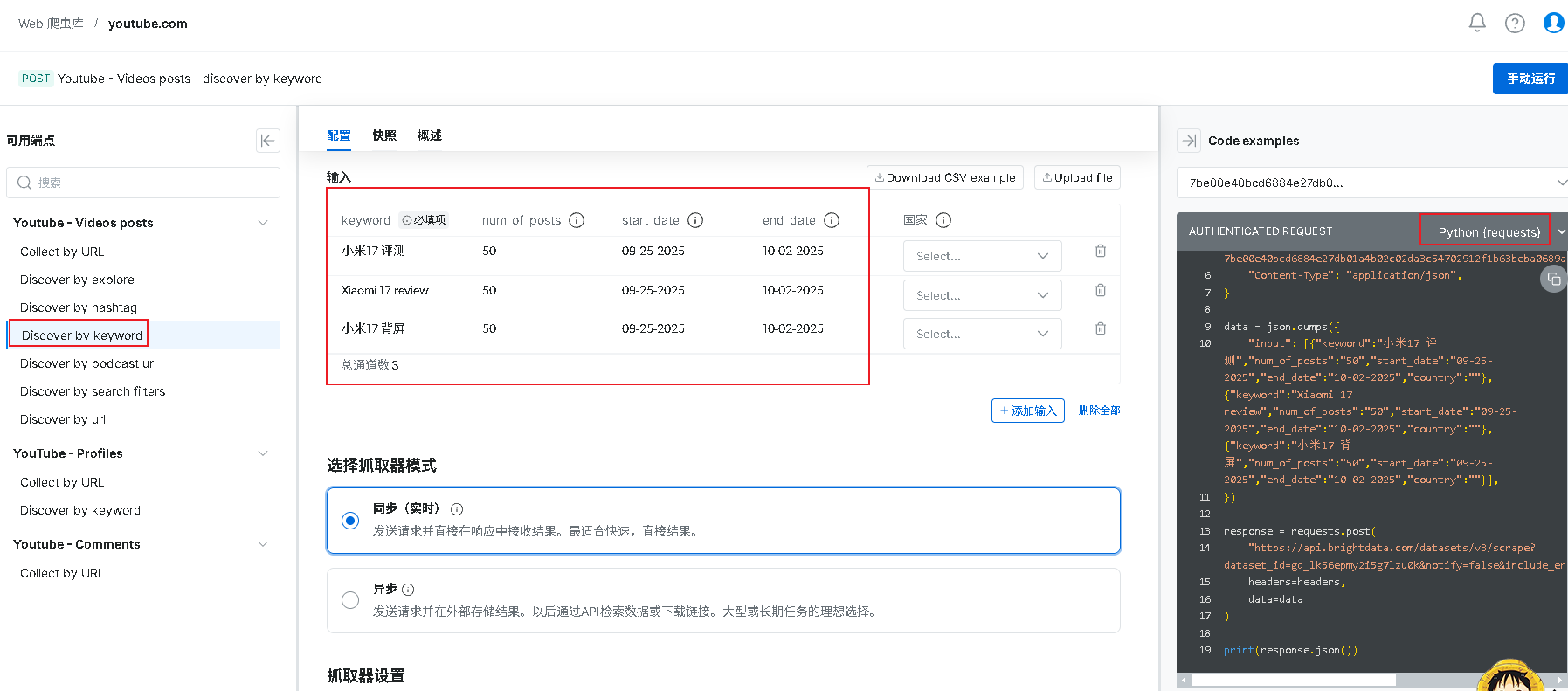 根据“小米17”舆情分析的需求,我们组合使用了Bright Data的Web Scraper API中的两大核心产品: