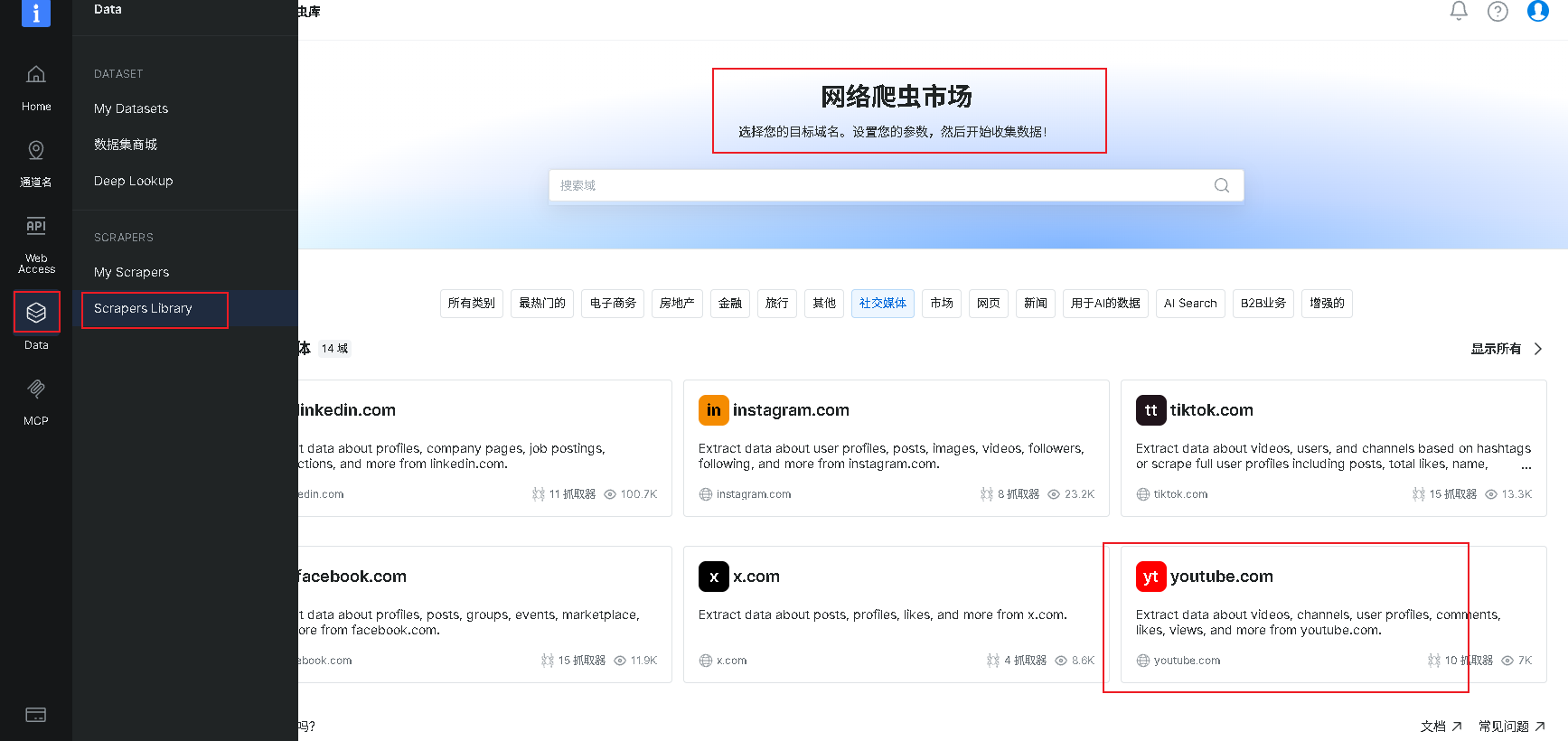 1.登录平台后,点击左侧导航栏的 “Data” 模块,进入数据管理页面,然后选择 “Scrapers Library”(爬虫库),进入网络爬虫市场。