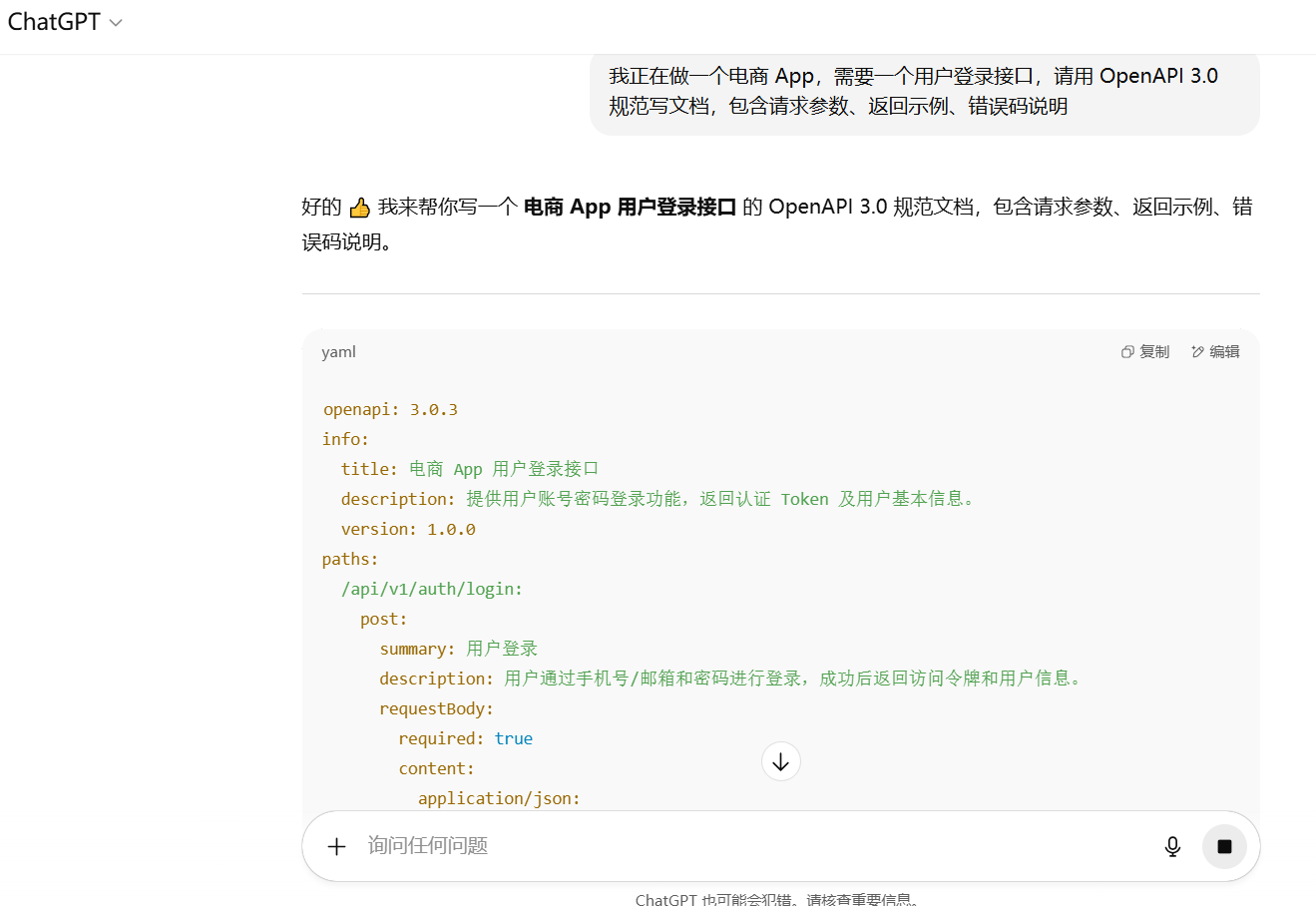 ✅ 我正在做一个电商 App,需要一个用户登录接口,请用 OpenAPI 3.0 规范写文档,包含请求参数、返回示例、错误码说明