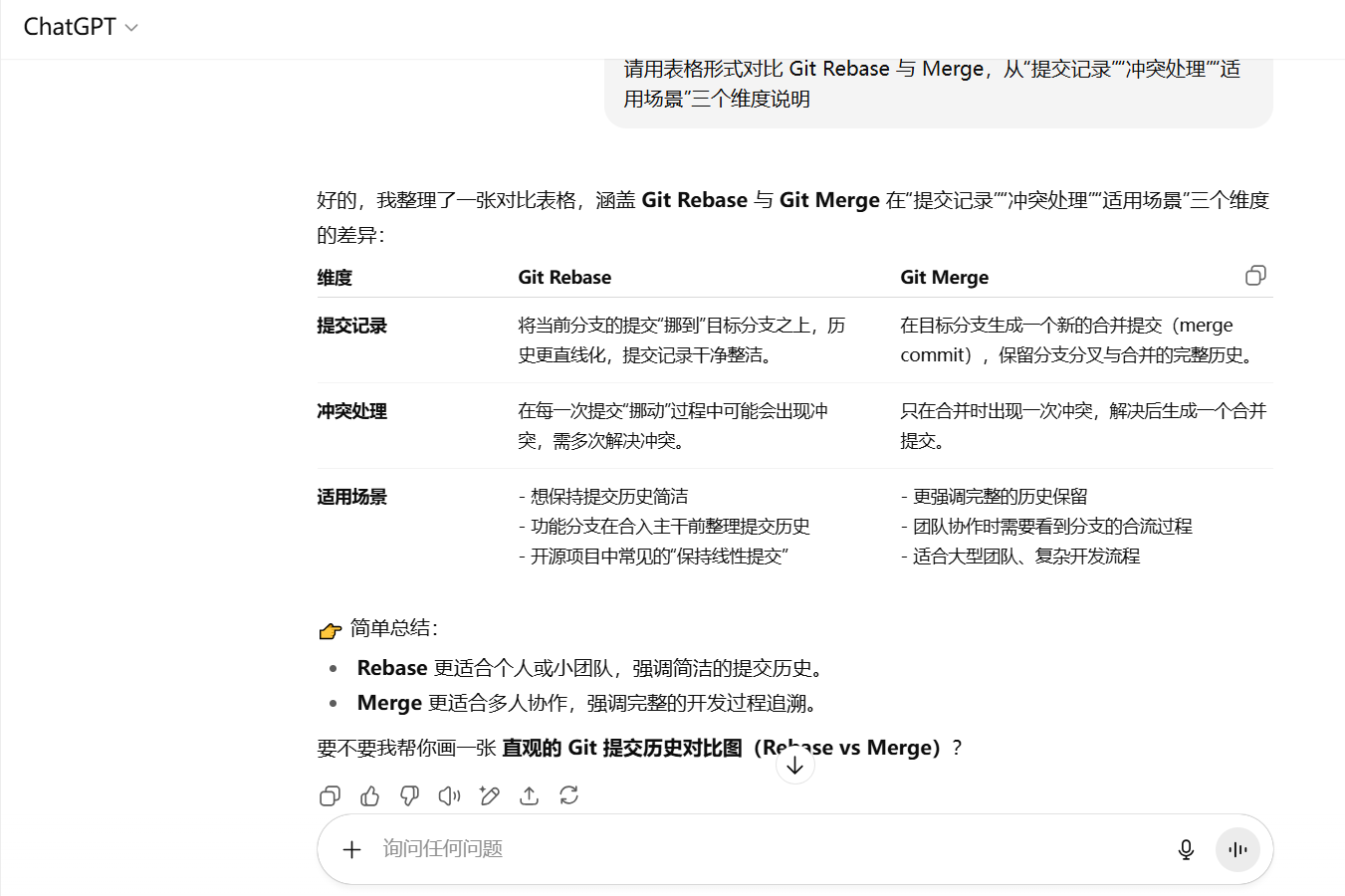 ✅ 请用表格形式对比 Git Rebase 与 Merge,从“提交记录”“冲突处理”“适用场景”三个维度说明