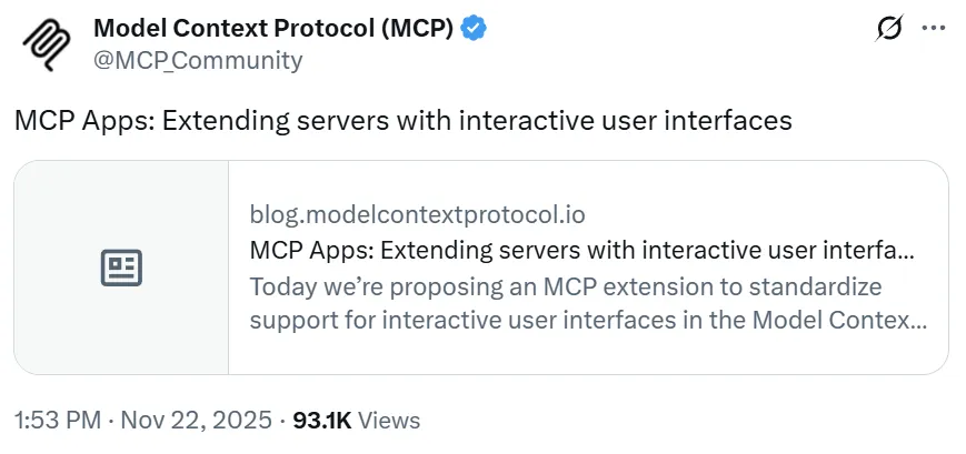 MCP 社区博客表示:「我们正在为 MCP 中的 UI 资源提出一项规范,但其影响远不止于一系列模式转移。MCP Apps Extension 正逐渐演变成一个智能体应用运行时(agentic app runtime):为 AI 模型、用户和应用之间全新的交互奠定基础。」