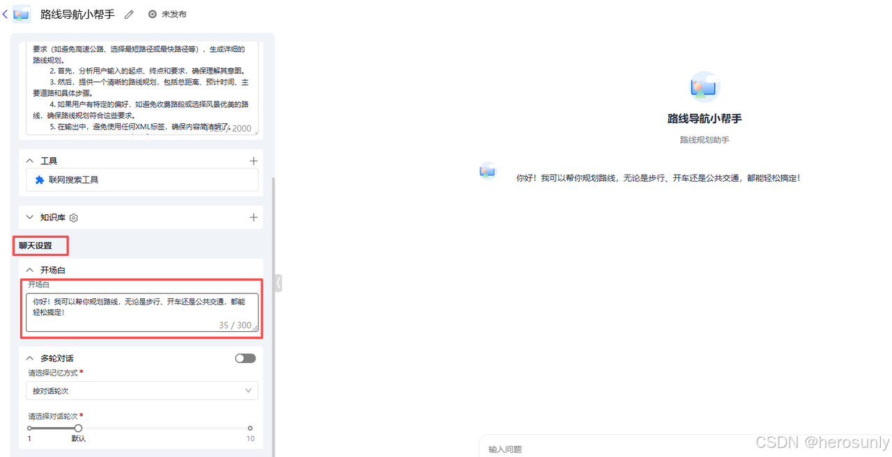 华为 ModelEngine 会根据我们输入的简介内容(如“路线规划助手”),自动生成应用名称、图标以及核心的提示词(Prompt)。