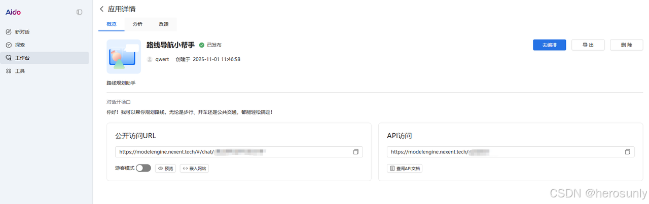 点击应用卡片进入智能体详情页,平台提供了公开访问的 URL 链接以及 API 访问接口。这意味着你可以直接将这个助手分享给朋友,或者将其集成到你自己的网站和 App 中。
