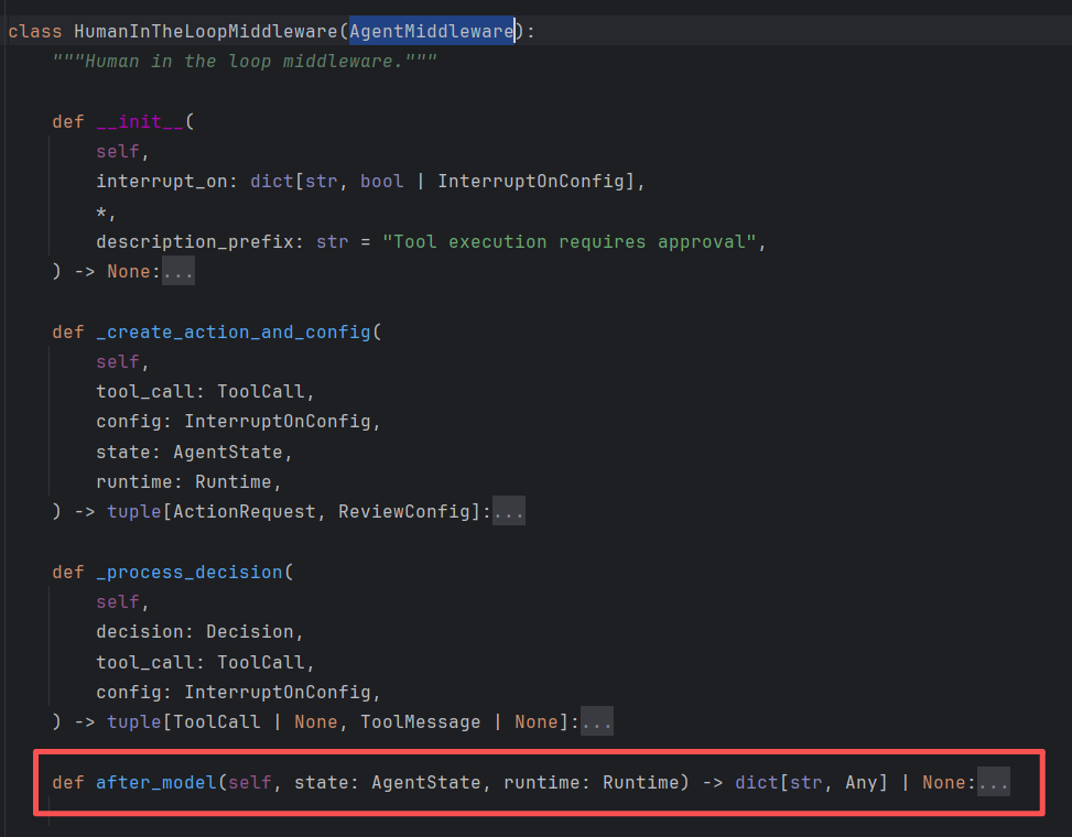 通过查看 HumanInTheLoopMiddleware 中间件的源码,我们发现它继承了 AgentMiddleware 基类。主要通过重写 after_model 方法来实现审批机制。其核心工作原理是: