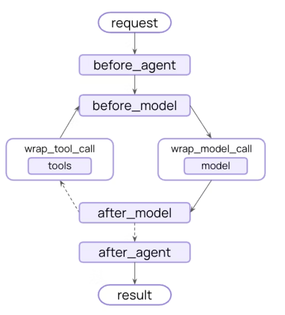 | wrap_tool_call | 围绕每次工具调用(可拦截) | 拦截并修改工具执行过程 |