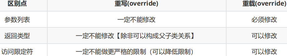1.方法名、参数列表(个数、类型、顺序)、返回值完全一致(是父子关系时返回值可以不同)
