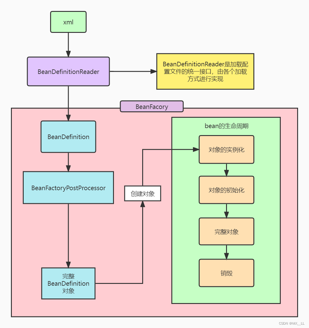 Spring 首先会读取配置文件(如 XML 或注解),解析 <bean> 标签中的定义,例如: