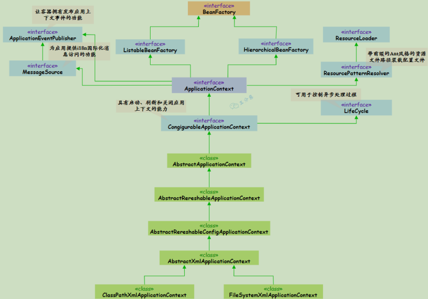ApplicationContext 继承了HierachicalBeanFactory和ListableBeanFactory接口,在此基础上,还通过其他的接口扩展了ApplicationContext的功能,包括: