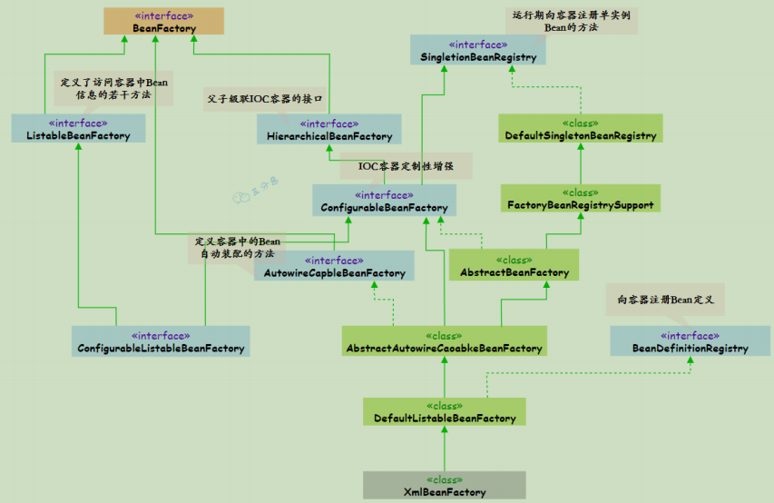 BeanFactory的功能通过其它的接口得到了不断的扩展,比如AbstractAutowireCapableBeanFactory定义了将容器中的Bean按照某种规则(比如按名字匹配、按类型匹配等)进行自动装配的方法。
