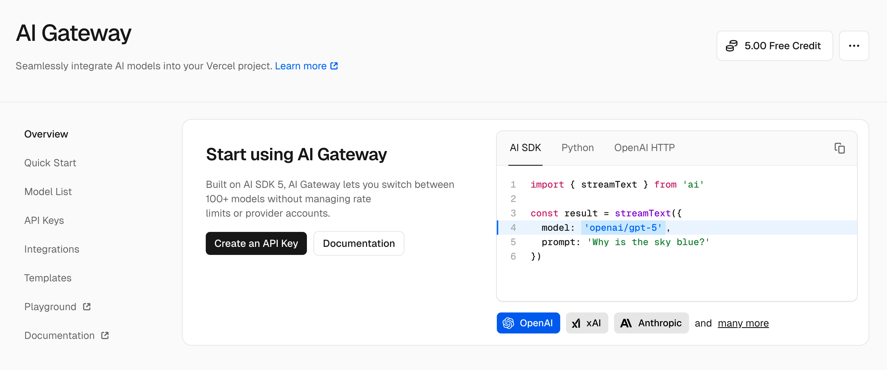 1)Vercel AI Gateway:这是最近很火的一个新产品,最大的特点是上手容易,而且 零加价,如果你使用自己的 API Key,网关本身不收额外费用。适合前端开发者快速搭建全栈 AI 应用。