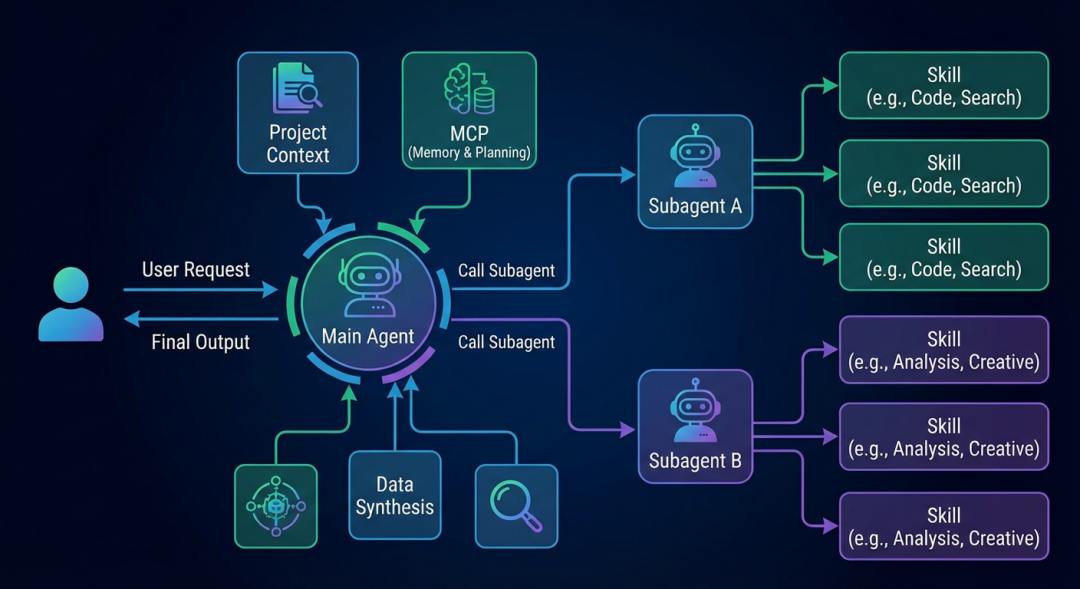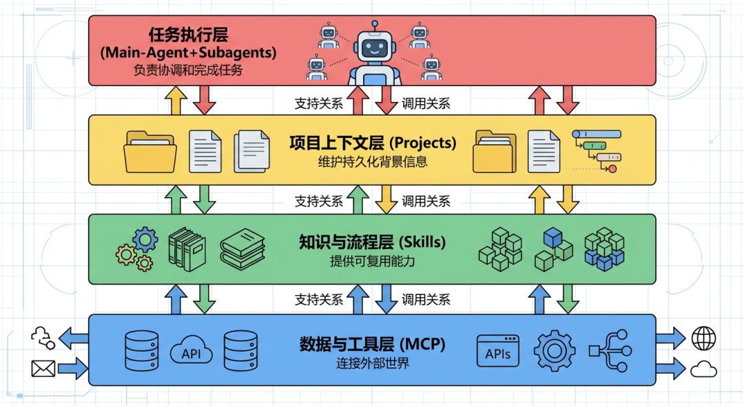 当AI智能体从对话式助手演进为承担核心业务流程的自主角色时,其开发模式必然从“提示词技巧”转向“系统工程”。今天我将以Anthropic Claude平台为准,深度剖析其四大核心构件——Skills(技能)、Projects(项目)、Subagents(子智能体) 和 MCP(模型上下文协议)。通过详实的代码示例、配置文件和架构图,揭示如何通过模块化设计构建可复用、可扩展、安全可控的企业级AI工作流,希望能帮助到大家。
