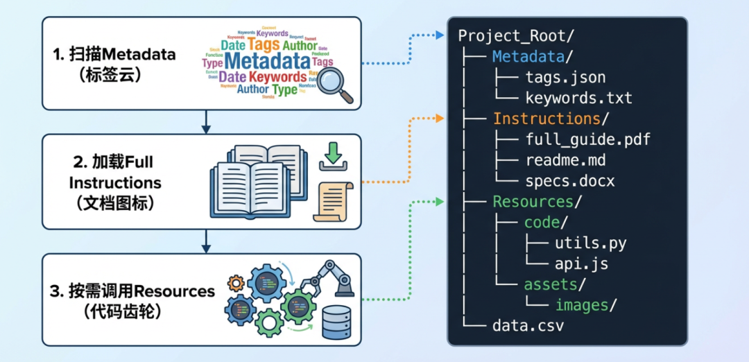 这种机制使得单个智能体可以挂载数百个Skills而无需担心上下文窗口被淹没,实现了“海量技能,按需取用”。