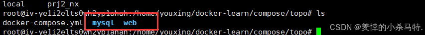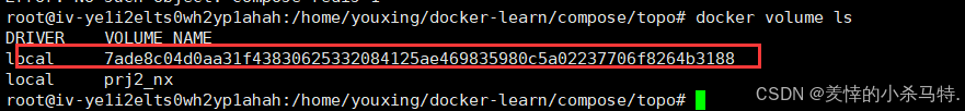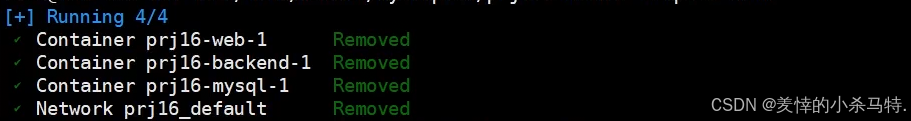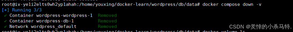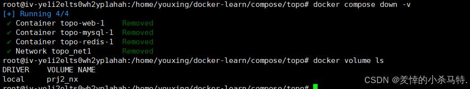 - 发现这里默认与启动顺序相反,因为对应依赖关系必须保持一致(比如web依赖mysql redis,因此就需要先移除web);对应redis匿名卷也被移除了。