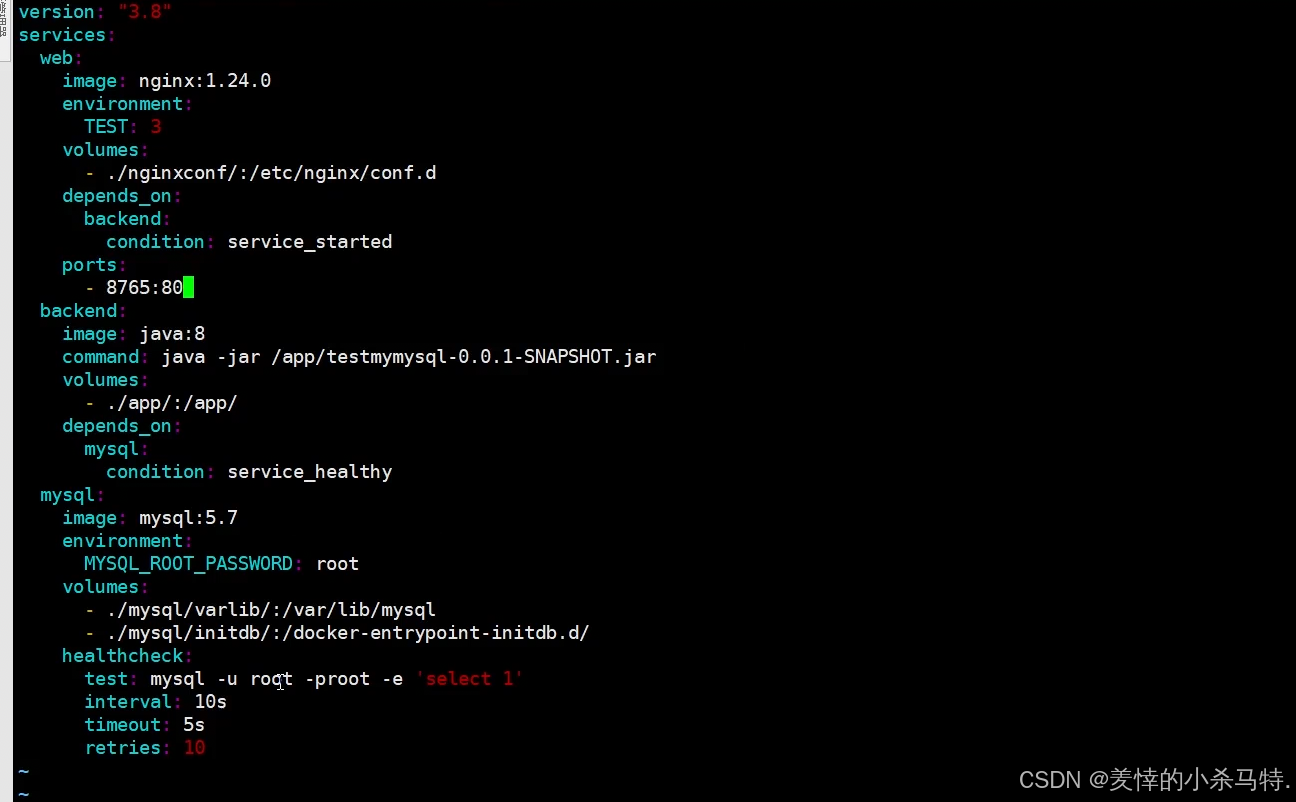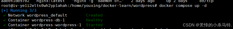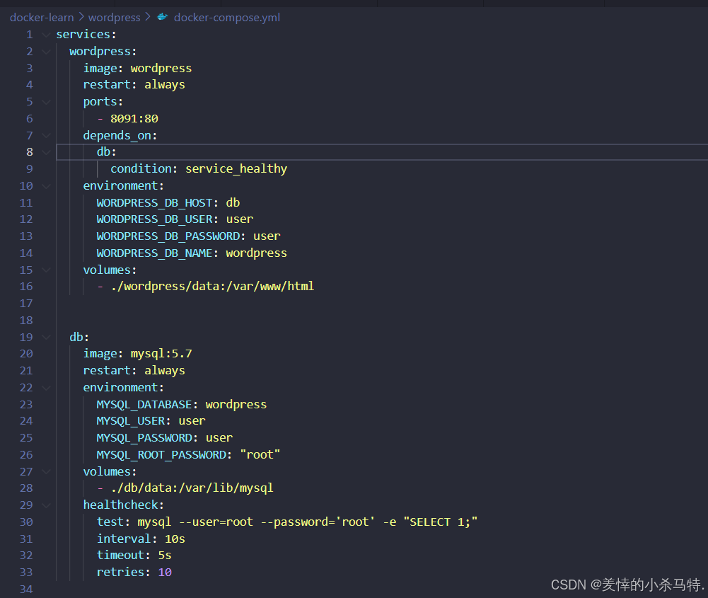 db: condition: service_healthy:关键:表示 wordpress 服务必须等待 db 服务变得健康(通过健康检查确认)后才会启动。